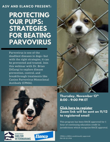 ASV and Elanco Present: Protecting our Pups: Strategies for for Beating Parvovirus Parvovirus is one of the deadliest diseases in dogs—but with the right strategies, it can be prevented and treated. Join this webinar with Dr. Brian DiGangi to explore disease prevention, control, and breakthrough treatments like Canine Parvovirus Monoclonal Antibody (CPMA) Click here to register! Zoom link will be sent on 11/12 to registered email This program has been RACE approved for 1 hour of continuing education credit in jurisdictions which recognize RACE approval